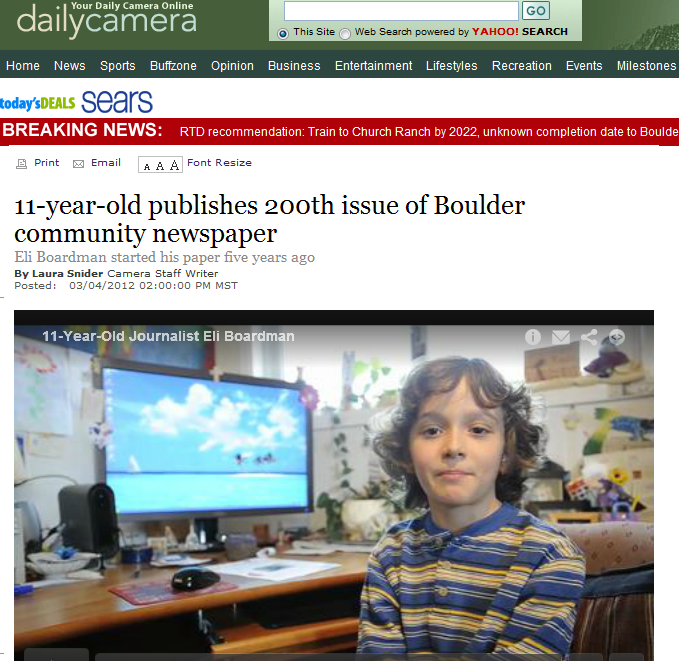 Residents of one south Boulder neighborhood can get the Boardman Camera personally delivered once a week by the publisher (who is also the editor, reporter, illustrator, ads salesman, circulation manager and distributor): 11-year-old Eli Boardman.